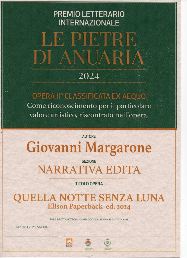 Il 24 marzo 2025, nella Sala Promoteca del Campidoglio in Roma, si è svolta la cerimonia di premiazione del 2° Premio Letterario Internazionale “Le Pietre di Anuaria” edizione 2024. Durante l’evento, ho ricevuto il 2° premio per il mio romanzo “Quella notte senza luna”.