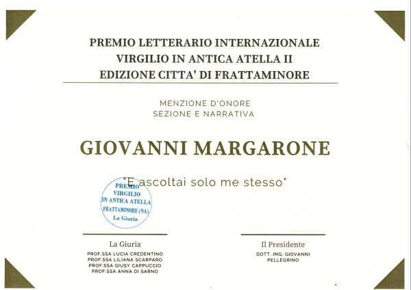 E' dell'ultima ora la notizia che il romanzo "E ascoltai solo me stesso" ha vinto il Premio Speciale "La città di Ruggero" al 5^ Concorso Internazionale di Poesia e Narrativa Città di Cefalù 2019. Non è ancora nota la data della premiazione che avverrà nel mese di aprile 2020. Ringrazio al Giuria, onorato e commosso,... Continua a leggere →