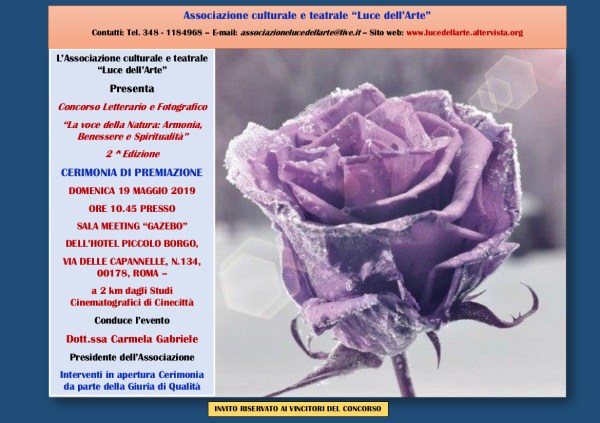 Roma, 28 aprile 2019 "Note fragili" vince il 1° Posto al Concorso letterario e fotografico "La voce della Natura: Armonia, Benessere e Spiritualità" 2^ Edizione organizzato dall’Ass. Luce dell’Arte per la Sezione C Narrativa, Saggistica, Teatro e Sceneggiatura a tema libero. La cerimonia di premiazione si terrà domenica 19 Maggio 2019 a partire dalle ore... Continua a leggere →